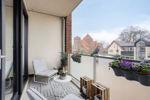 Via de openslaande deuren in de woonkamer stap je zo het balkon op. Dit fijne balkon ligt op het oosten. Hier kun je heerlijk in de zon zitten onder het genot van een kop koffie, terwijl de dag rustig begint.