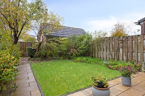 De tuin ligt op het westen en is aangelegd met een zonneterras met sierbestrating, een gazon en borders met verschillende bloemen en planten. In de tuin kun je gedurende de hele dag van de zon genieten en het grote zonnescherm zorgt voor een schaduwrijk plek. Deze tuin is perfect om lekker te ontspannen, te borrelen of gezellig te barbecueën met familie en vrienden. En dankzij de berging en de achterom is de tuin ook nog eens praktisch in gebruik. De stenen berging achter in de tuin heeft veel stalling -en bergruimte en er is zelfs een zolder voor de extra opslag. Achter de tuin ligt een groot plein met garages en een groot speelveld voor de kinderen.