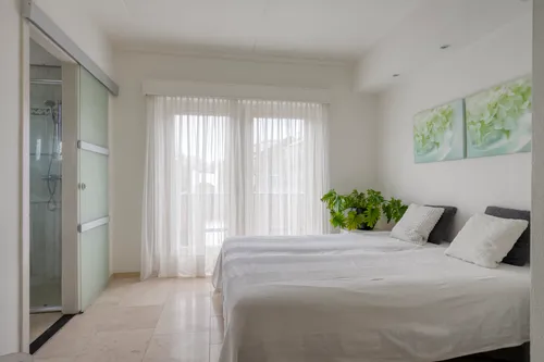 Er is een aparte ruime slaapkamer met Frans balkon, deze geeft toegang tot de badkamer. De badkamer heeft een douche, hangend toilet, badkamerkast, wastafel met meubel en tevens tref je hier de aansluiting voor de wasmachine.
