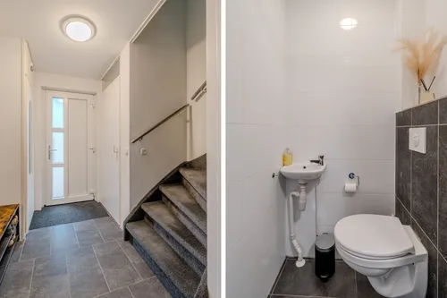 Entree, hal met meterkast, garderobe, trap naar de verdieping, toiletruimte met hangend toilet en fonteintje. Deur naar de woonkamer. De woonkamer is tuingericht en is naar achteren uitgebouwd. De uitbouw is voorzien van een grote lichtkoepel, wat zorgt voor veel lichtinval. Er is door de uitbouw een fijne living ontstaan met ruimte voor een royale zit-of loungehoek en zelfs voor een grote eettafel, waar je gezellig met het hele gezin, je familie en vrienden heerlijk kunt tafelen. Vanuit de woonkamer is er een deur naar de veranda. De veranda kan worden afgesloten met een glazen pui. Dit is echt een fantastische overdekte ruimte, waar je ook bij minder mooie dagen van de tuin kunt genieten. En vanuit de veranda stap je zo de onderhoudsarme tuin in, deze is voorzien van een praktische berging en er is een achterom.