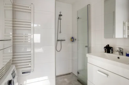 De slaapkamer bevindt zich aan de voorzijde van het complex en is van een goed formaat. Via de slaapkamer heb je toegang tot de nette badkamer met douche, wastafel met meubel en aansluiting voor de wasmachine.