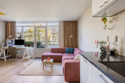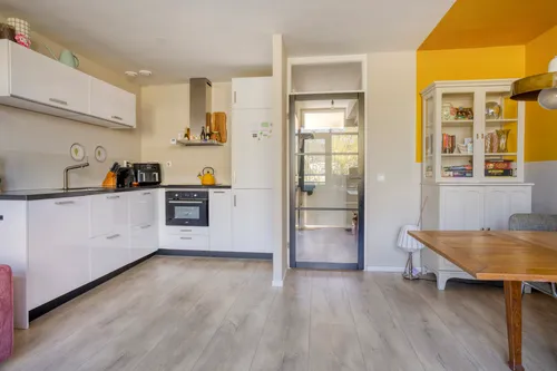 De lichte woonkamer is een heerlijke leefruimte met een nette laminaatvloer en strak gestuukte wanden. Dankzij de grote raampartijen valt er veel daglicht binnen. De open keuken in L-opstelling biedt verrassend veel opbergruimte en is compleet uitgerust met inbouwapparatuur, waaronder een inductiekookplaat, afzuigkap, vaatwasser, combi-oven (2025), koelkast en vriezer.