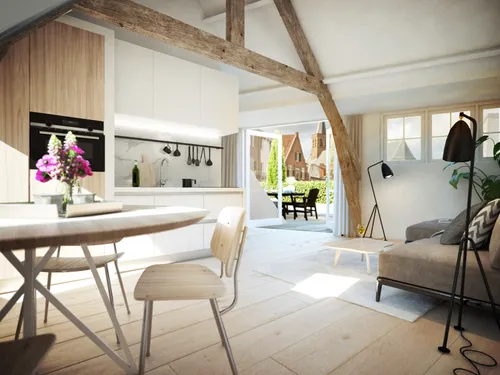 Geen appartement in het pakhuis of het woonhuis is gelijk. In het woonhuis tref je deze beschikbare maisonnette woning met bovenin een zonovergoten loftwoning, met woonkamer en open keuken, 1 slaapkamer, een badkamer én als kers op de taart een eigen dakterras! Je geniet van hedendaags wooncomfort. We isoleren en verduurzamen (gasloos, warmtepomp) het pakhuis en het woonhuis waarbij we authentieke details van weleer in ere laten. in iedere ruimte is er vloerverwarming, zodat je in huis altijd op blote voeten kunt lopen.
