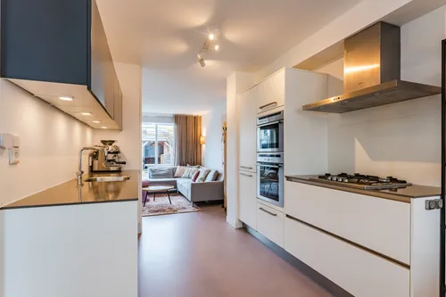 Via een mooie glazen loftdeur kom je in de keuken. Er is ruimte voor een gezellige eethoek. Een perfecte plek om gezellig met je gezin, je familie en vrienden heerlijk te dineren en lekker lang te tafelen. De moderne keuken is geplaatst in 2 rechte opstellingen en is voorzien van diverse inbouwapparatuur, waaronder