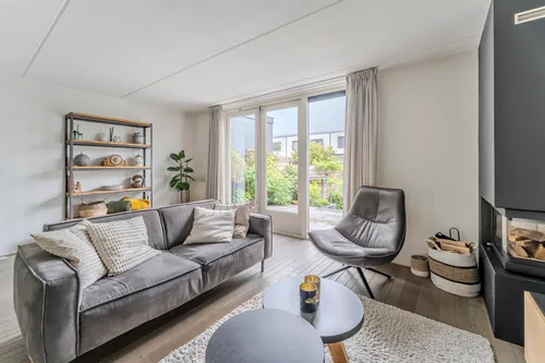 Bij binnenkomst valt meteen de stijlvolle hoge metalen taatsdeur op, die de hal met de woonkamer verbindt en het geheel een moderne uitstraling geeft. De toiletruimte is keurig afgewerkt met een hangend toilet en fonteintje. De tuingerichte woonkamer ademt sfeer en warmte. Dit mede door de gezellige zithoek met moderne haard. Een heerlijke plek om lekker te ontspannen en van je vrije tijd te genieten. Via de openslaande deuren sta je zo in de achtertuin, waar binnen en buiten naadloos in elkaar overlopen.
