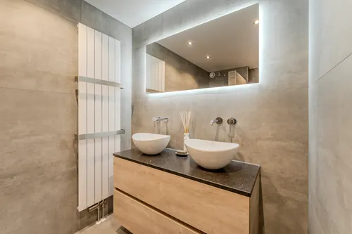 - Luxe badkamer met inloopdouche en dubbele waskom en badkamermeubel.
