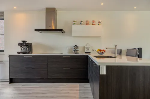 De royale woonkamer is heerlijk licht door de schuifpui en is direct verbonden met de achtertuin, waardoor binnen en buiten naadloos in elkaar overgaan. De moderne L-vormige open keuken uit 2016, is voorzien van alle benodigde inbouwapparatuur en u kijkt prachtig weg over de polder, perfect voor het bereiden van heerlijke maaltijden. De gehele begane grond is uitgerust met een PVC vloer met vloerverwarming, wat zorgt voor een aangename temperatuur en extra comfort.