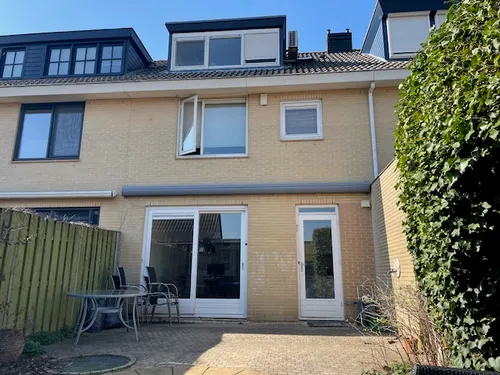 De achtertuin is gunstig gelegen op het zuidoosten, waardoor je hier volop van de zon kunt genieten. Op warme dagen biedt het grote zonnescherm een heerlijke schaduwplek. Achterin de tuin staat een vrijstaande houten berging, perfect voor fietsen en tuinspullen.