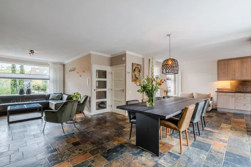 Bij binnenkomst tref je een nette hal met toiletruimte en trapopgang naar de 1e verdieping. De ruime woonkamer is voorzien van een plavuizenvloer met vloerverwarming en een gezellige allesbrander. Dankzij de uitbouw aan de zijkant is er een prachtige, lichte woon-/eetkamer ontstaan met veel raampartijen.