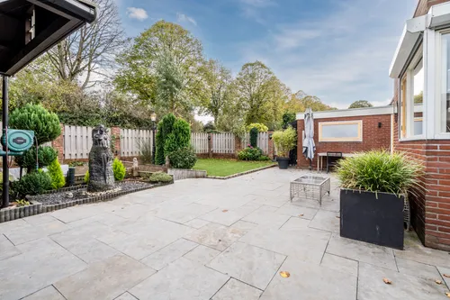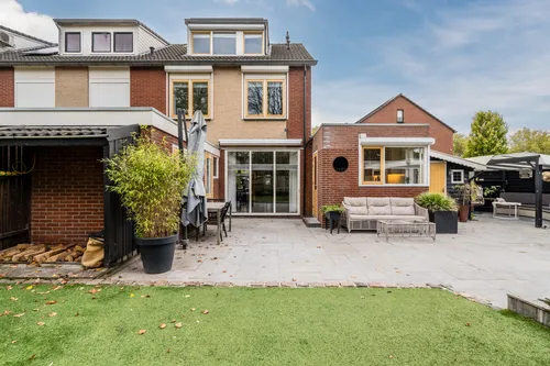 De fraai aangelegde achtertuin is een heerlijke plek om te ontspannen. Er is een groot terras, een gezellige zit-/loungekuil, een aangebouwde houten berging en een veranda die afgesloten kan worden met op maat gemaakte zeilen. Het elektrisch bedienbare zonnescherm en de rolluiken bij de keukenramen zorgen voor extra comfort.