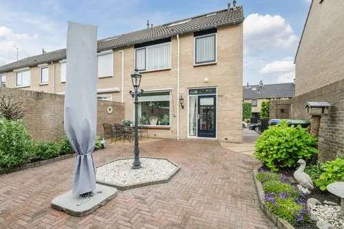 De tuin is keurig en onderhoudsarm aangelegd met sierbestrating en verschillende borders. Het is een fijne plek om van je welverdiende rust te genieten. Achter in de tuin staat een garage met een grote carport, waardoor je parkeergelegenheid hebt op eigen terrein.