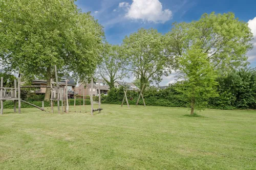 Grote tuin met garage, carport en een achterom, aangrenzend aan een plein en speelweide.
