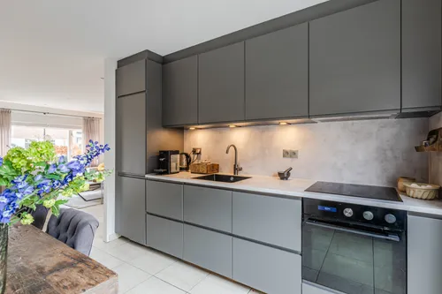 Via de entree bereikt u de hal met meterkast en toegang tot de lichte woonkamer. De woonkamer is voorzien van een plavuizen vloer met vloerverwarming en openslaande deuren naar de achtertuin, moderne open keuken die is uitgerust met diverse inbouwapparatuur waaronder een keramisch kookplaat, koelkast en vriezer, oven en afzuigkap, biedt een prettige verbinding met de leefruimte. Vanuit de woonkamer is er toegang tot de tussenhal met toilet en de open trapopgang naar de eerste verdieping.
