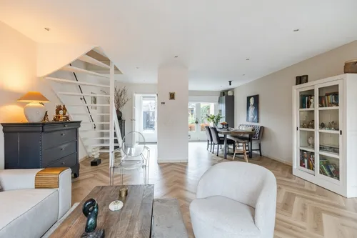 Via de entree bereikt u de hal met meterkast en toegang tot de lichte woonkamer. De woonkamer is voorzien van een plavuizen vloer (Foto 4 voor inspiratie leggen visgraatgelegde PVC-vloer, AI) met vloerverwarming en openslaande deuren naar de achtertuin, moderne open keuken die is uitgerust met diverse inbouwapparatuur waaronder een keramisch kookplaat, koelkast en vriezer, oven en afzuigkap, biedt een prettige verbinding met de leefruimte. Vanuit de woonkamer is er toegang tot de tussenhal met toilet en de open trapopgang naar de eerste verdieping.