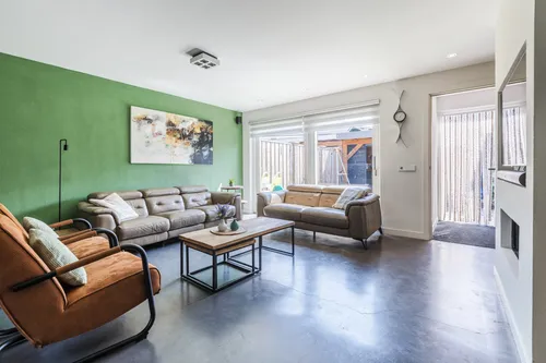 Loop je verder door, dan kom je in de woonkamer waar plek genoeg is voor een royale zithoek en een grote eettafel. De schuifpui geeft toegang tot de achtertuin, waardoor binnen en buiten hier op een natuurlijke manier in elkaar overlopen.