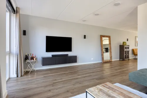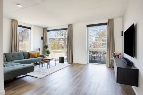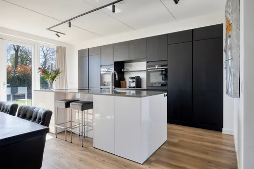 Entree met hal, meterkast, toilet met fontein en praktische trapkast. De L-vormige woonkamer is voorzien van een stijlvolle pvc-vloer met vloerverwarming en geniet van veel natuurlijk licht dankzij de grote raampartijen. De luxe open woonkeuken met kookeiland is volledig uitgerust met hoogwaardige inbouwapparatuur, waaronder een Quooker, twee koelkasten, kookplaat met afzuiger, stoomoven, combi-oven en een wijnklimaatkast. Openslaande deuren geven toegang tot de zonnige achtertuin.