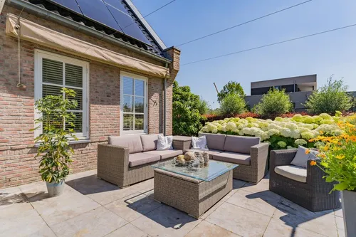 - Erker met grote raampartij en openslaande deuren naar de tuin.