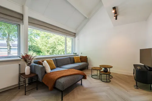 - Lichte woonkamer met hoog plafond en mooie PVC-vloer (visgraat gelegd)